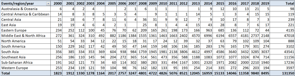 Tab.1 – Numero di eventi terroristici per macro-regione, periodo 2000-2019.