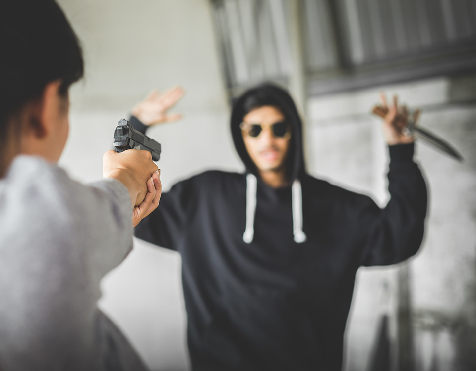 - Proporzionalità tra difesa ed offesa: ecco il punto di certo maggiormente oggetto di discussioni, spesso affrontate con accezioni palesemente errate. La proporzionalità tra difesa ed offesa, infatti, non deve intendersi riferita esclusivamente agli strumenti in possesso del difendente rispetto a quelli in possesso dell’offendente, ma anche e soprattutto in relazione al bene messo a repentaglio. Pertanto il ragionamento corretto non è bastone contro bastone, coltello contro coltello o pistola contro pistola ma la proporzionalità è da valutare in relazione al bene messo a repentaglio (ad es. vita contro vita). Nella scena rappresentata è evidente come un coltello puntato alla gola metta certamente a repentaglio la propria vita: pertanto, nonostante la minaccia venga posta in essere con un’arma bianca, la reazione con un’arma da fuoco è assolutamente legittima.